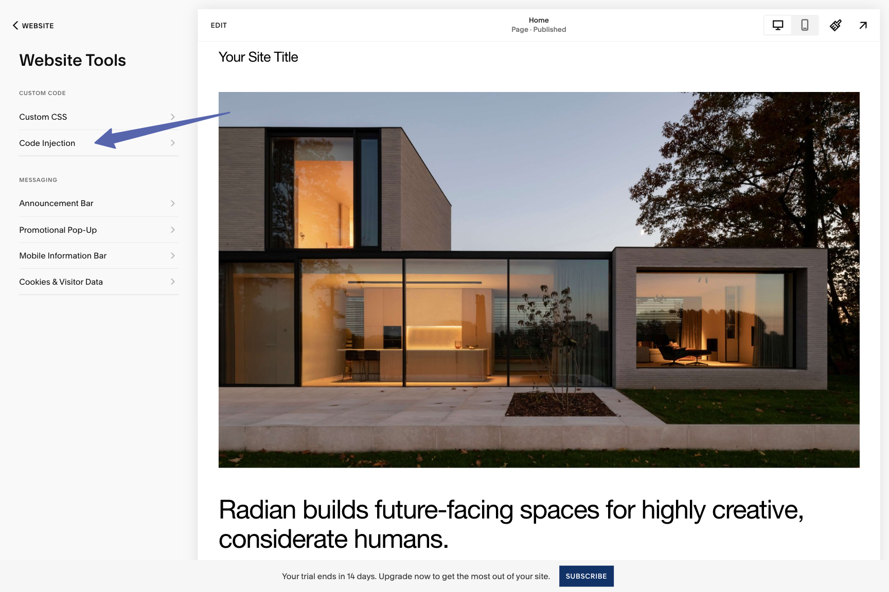 - Under Website Tools, click on Code Injection.