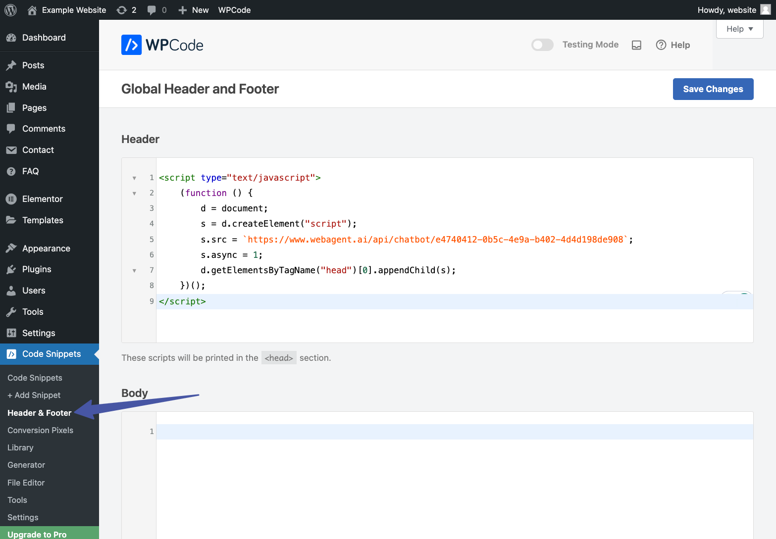 - Click on Code Snippets in the left-hand menu then on Header & Footer.